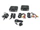 The transmitter has an IR extender so you can control your source devices by simply pointing your remote at the transmitter. The package includes both the transmitter and receiver unit, 2 AC adapters, an IR transmitter bulb, and a set of RCA Composite cables. An S-video cable can be used instead of the yellow composite video cable when applicable.