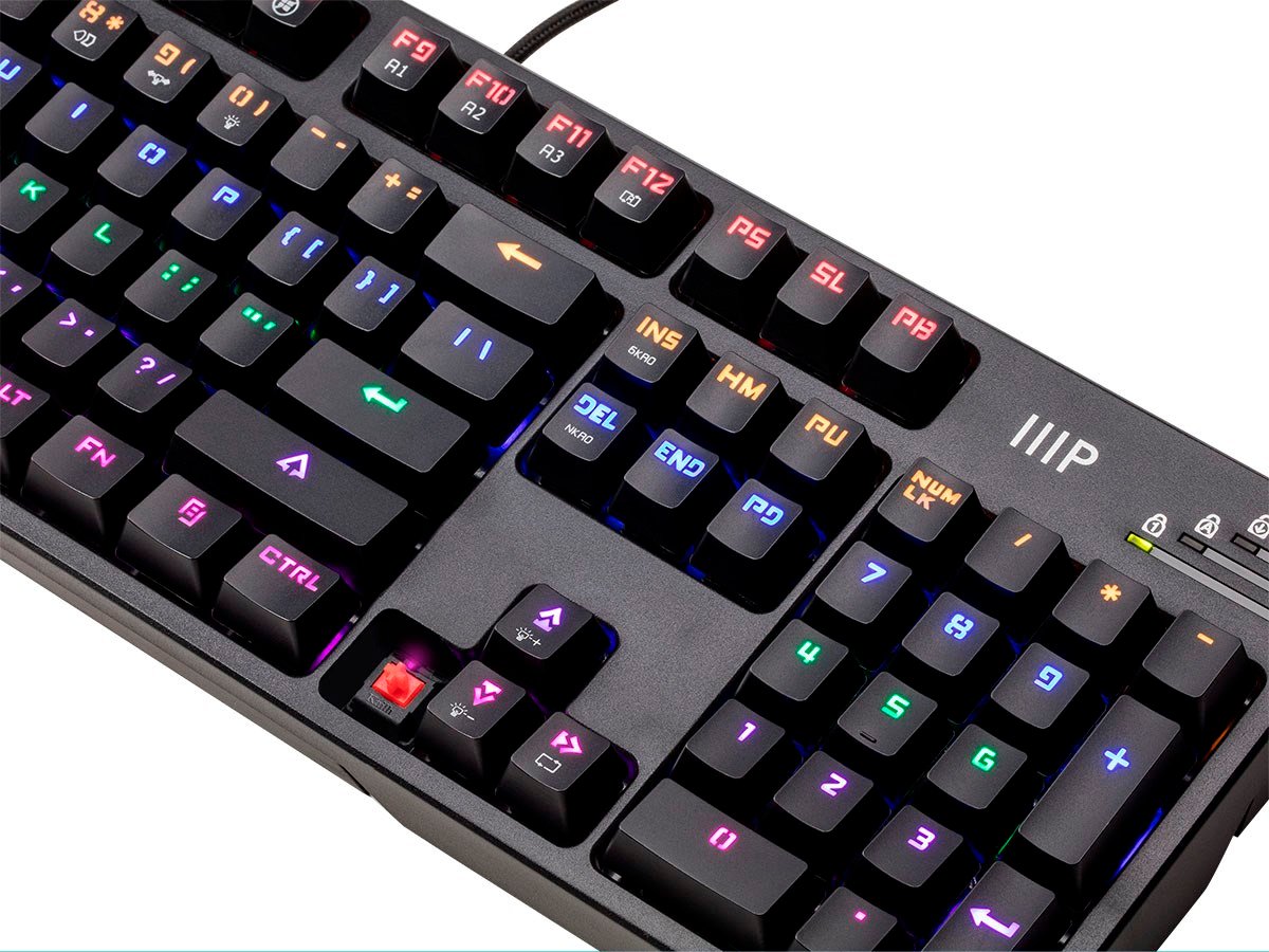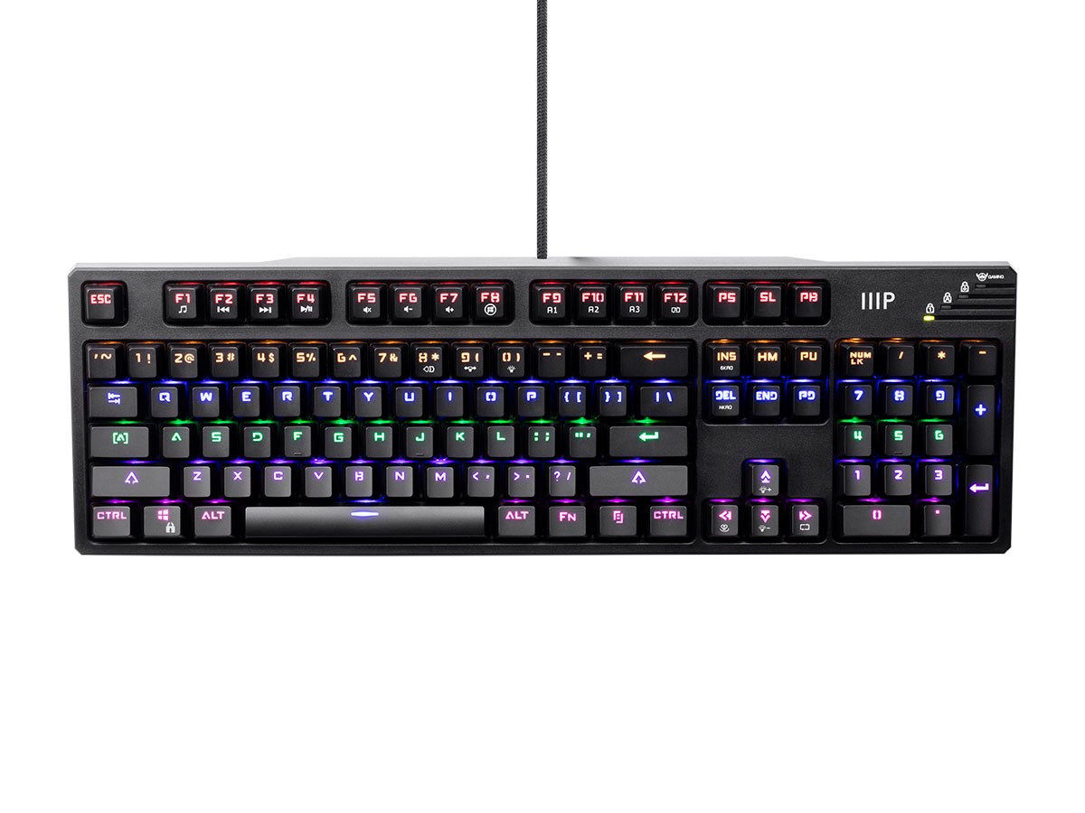 Continuing to bring value in professional grade products, Monoprice has refreshed its line of mechanical keyboards. This new series provides performance profiles for both mechanical RED and BLUE switches. It has full NKRO, so you will never miss a beat when ducking behind cover or providing covering fire. The refreshed backlit series comes with either RED or BLUE switches, multicolor and multipattern pre-programmed lighting options with multiple modes ( Marquee, Pulsing, and more) with braided cables to complete the look. There is no need to break the bank to experience the pleasure of mechanical key switches; enjoy professional grade performance at half the price of other keyboards! Monoprice gaming keyboards are designed for competitive play, crafted with high quality components and materials, and offer the great feel and responsiveness you need when victory is essential. They deliver incredible responsiveness and precision to elevate your game to the next level. Our expertly designed anti-ghosting technology provides flawless control even when you're pressing multiple keys at once. Monoprice mechanical keyboards have individual switches with dedicated diodes, so every key press results in an input and is 100% ghost free without tradeoff or compromise. The stiff suspension chassis and the laser-etched keys are made for durability so they won't degrade over time. The MP Backlit series has over 90 LEDs that provide outstanding illumination even in bright light.
