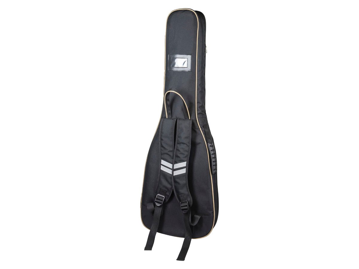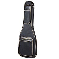 Carry your guitar in style with this Deluxe GigBag for Electric Guitar from Monoprice! This guitar bag is sized to fit most solid-body electric guitars, including the Monoprice California Classic, Retro Vision, and Route 66 guitars. It is made of heavy duty 600D nylon. Each seam is reinforced with a bead, so the bag will not come apart. The bag measures approximately 6" wide at the neck and 13" wide on the body. It is about 40" long, top to bottom, and about 3" thick. It is generously padded on all sides and is lined with nylon for maximum protection. An 8" square canvas patch is sewn into the inside of the bag, right above the bridge, so the sharp metal parts will not rip into the nylon lining. A similar patch is sewn into the bag above teh headstock, to keep the tuning pegs and string ends from ripping or tearing the fabric. A soft, wide loop at the top of the bag wraps around the neck to keep it securely in place. The front of the bag features two primary pockets and two thin, secondary pockets. The interior of the upper primary pocket measures about 12" tall by 4" wide and the lower primary pocket measures about 12" tall by 10" wide. Each primary pocket has about 1" interior thickness. The secondary pockets are outside the primary pockets and are more suited for thin items, such as strings, picks, sheet music, etc. The back of the bag features two adjustable shoulder straps, so you can carry your guitar on your back. A nylon loop handle above the shoulder straps is suited for hanging the bag and a windowed pocket is perfect for inserting a business or ID card. On the side is a reinforced nylon handle with plastic wrapping for a firm, comfortable grip. |