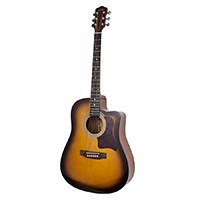 This full-sized electric/acoustic guitar features a single-cutaway dreadnought body style. It is constructed with mahogany sides and back, ply spruce top, a set-in nato (aka eastern mahogany) neck, rosewood fretboard, and chrome tuners. It features a built-in piezoelectric pickup with a 4-band equalizer built into the preamplifier, so you can plug in to amplify your sound. It uses coated steel and phosphor bronze wound strings in the following sizes: