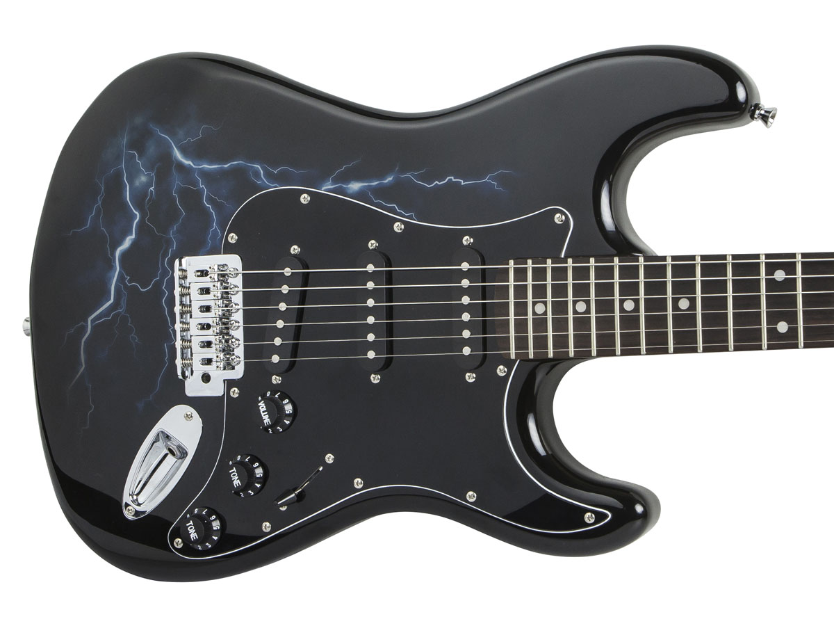 Unlike the other California Classic guitars, this model features a lightning graphic, as well as a black pickguard, knobs, switch end, rear electronics cover, and pickup bodies.