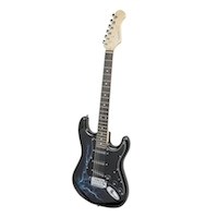This guitar arrived a couple weeks ago, in perfect condition. This is my fourth Monoprice guitar (2nd Strat clone) and I have been more than satisfied with all of them. This one was set up very well, and plays smooth as butter. Needed a tuning, but that's easy. Since I am the proud owner of a Ford SVT F1500 Lightning pickup truck, I naturally had to have a guitar with Lightning graphics...and the graphics on the guitar are very nicely done and I like the black theme with the blacked out pick guard and tone/volume controls. Paired it up with a matching lightning guitar strap from Guitar Center, and look is just killer.