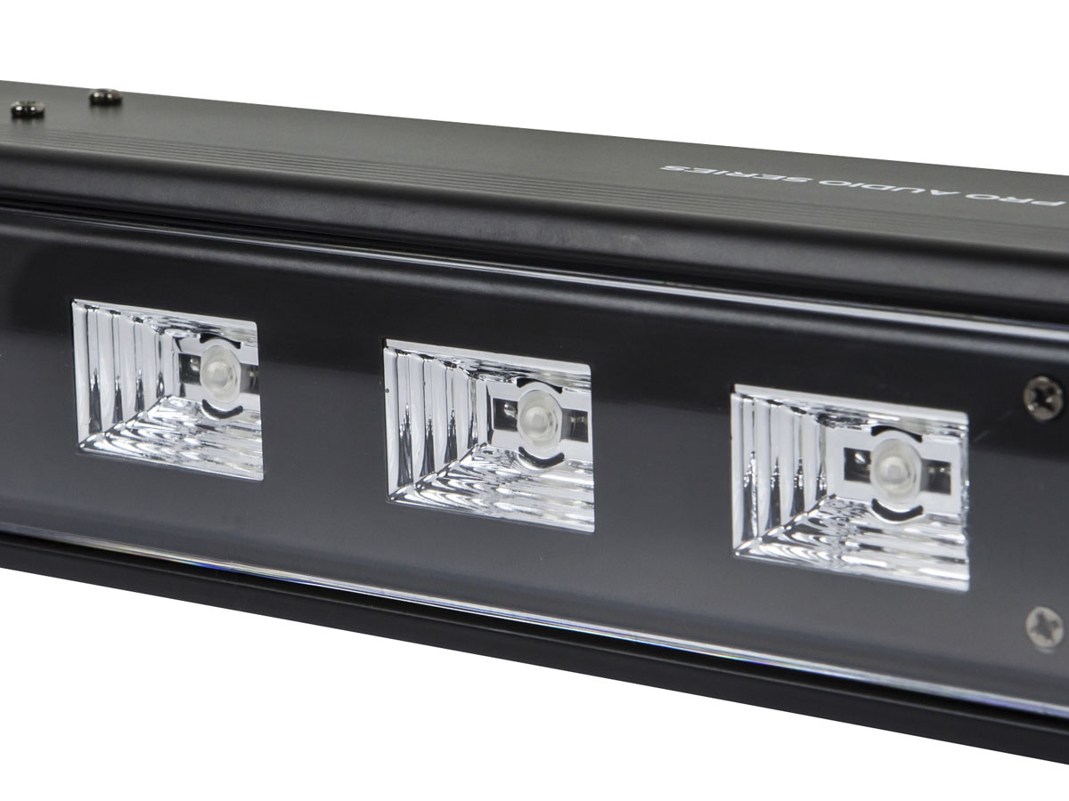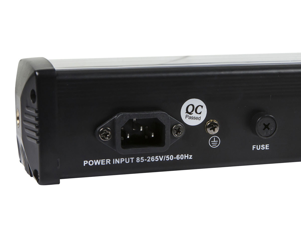 This light bar features ultraviolet LEDs, which produce a glowing flourescent effect on the audience, band members, and decor. It is DMX512 compatible and includes both 2-channel and 3-channel DMX operation modes. It also includes built-in automatic, strobe, and sound activation modes, for non-DMX installations. The bar features both power and DMX pass-through connectors, so you can daisy chain multiple lights together.