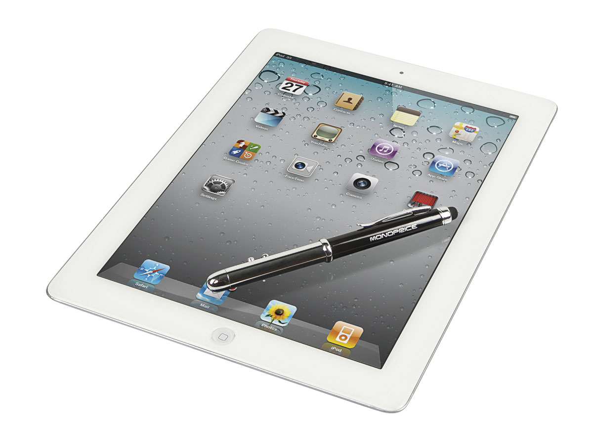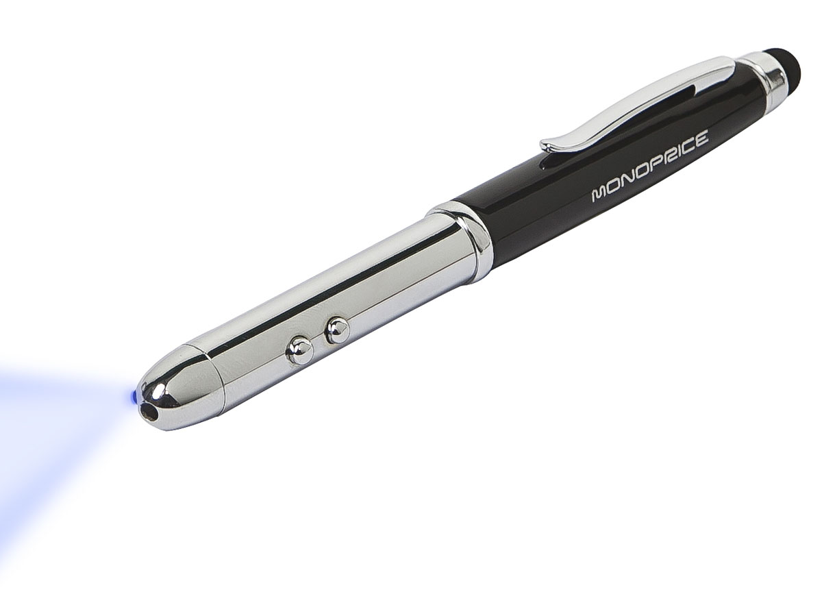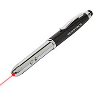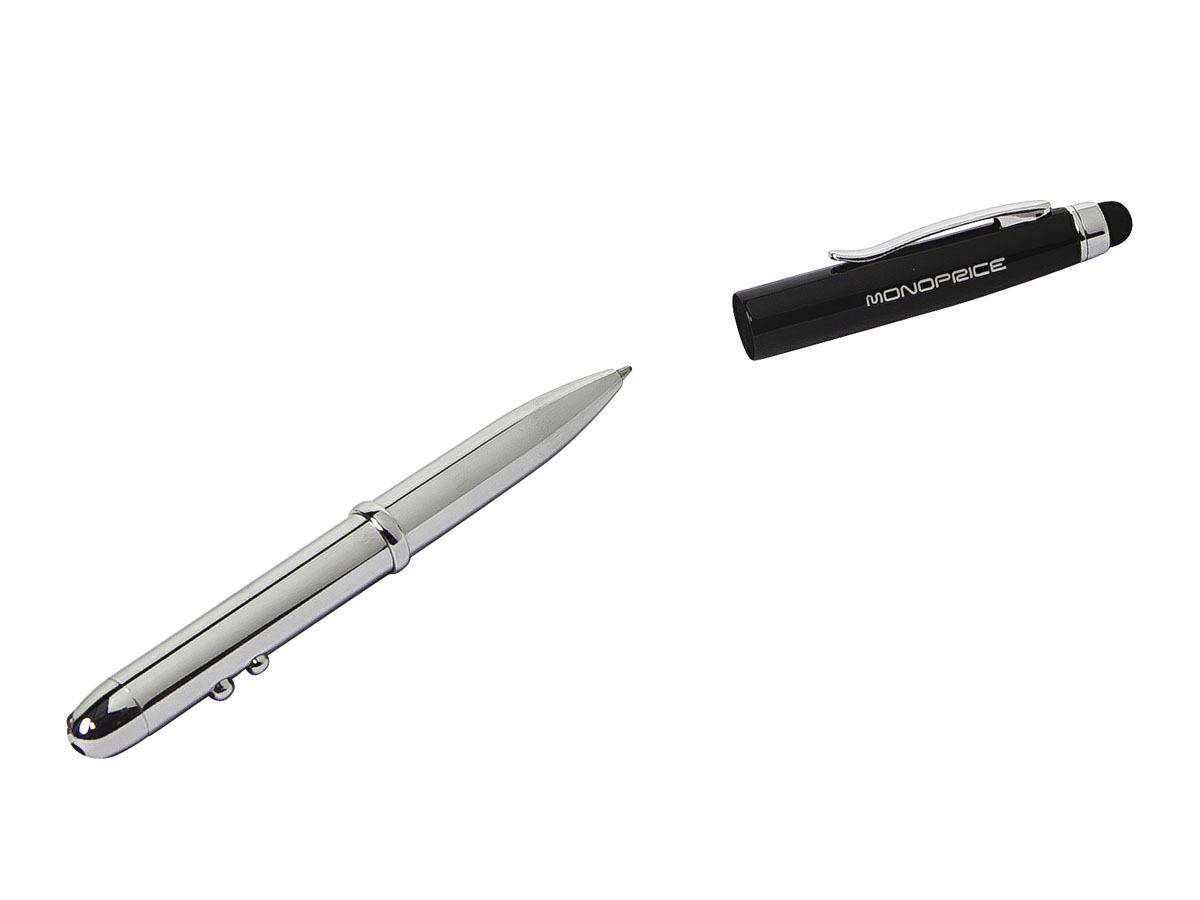 Get four functions in one compact form with this Stylus/Laser Pointer/Flashlight/Ink Pen from Monoprice! This stylus is designed to take the place of prominence in your pocket or purse. It features a capacitive touch screen stylus tip at the end of the pen cap. The electrical current in your fingers is transmitted through the stylus body to the tip, thereby allowing it to activate touch screen devices. At the other end of the closed pen is a laser pointer and flashlight, each operated by its own dedicated push button. The Laser Pointer/Flashlight is powered by 2x LR41 button batteries in the body of the pen/stylus. Pulling the cap off the stylus reveals the ink pen, while the cap fits snugly onto the other end of the pen. The ink cartridge can be replaced, allowing this pen to be useful for years to come! The stylus measures about 5.25" long when closed and about 6.4" long with the ink pen revealed and the cap on the other end. It uses a Cross-style Mini Ballpoint Pen Refill cartridge. |