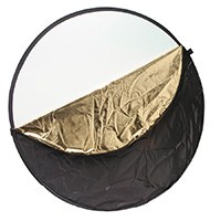 The reflector is made with a durable steel frame, which can be collapsed down to about 1/3 its full size. The translucent reflector core is contained in a zippered outer pocket, which includes the other four surfaces. By default the silver and black sides are exposed. Reversing the pocket reveals the white and gold sides. The reflector comes in a zippered nylon carry/storage pouch measuring about 16" in diameter. |