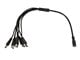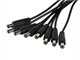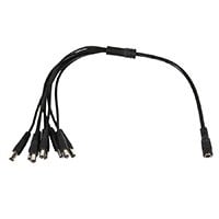 This cable assembly is designed to split a CCTV power line into eight outputs. The source end uses a male DC connector, while the outputs have female DC connectors. Each DC connector has an outside barrel diameter of 5.5mm and an inside pin diameter of 2.1mm. The cable on each side of the split is about 7" long, with a total assembly length of about 16". |